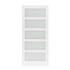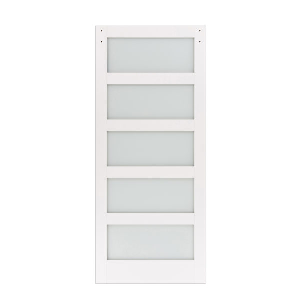 Engineered wood in a Bright White with a textured wood grain painted look and 5 tempered frosted glass inserts