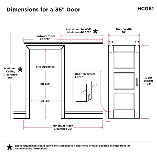 36” x 84" x 1-3/8”; fits 28” - 34” wide opening