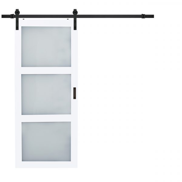 Presenting a modern look that balances daylight and privacy, our 3-Lite Hall Barn Door offers the perfect passageway for more than hallways and closets. Imagine the possibilities of this translucent look on display in your kitchen, living room or home office. Our horizonal, 3-Lite, tempered frosted glass design is framed in solid engineered wood, pre-finished for durability in a choice of colors and appointed with Rustic Matte Black hardware. This modern barn door provides dependable, smooth operation and its trackless design maintains clear, hazard-free floor openings.