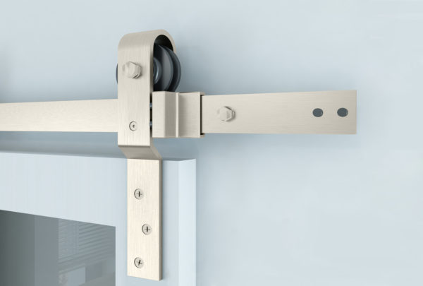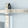 A modern twist to a Bent Strap hanger allows the use of the single track for your double barn doors to bypass over each other while still maintaining the smoothness of travel along the track. Available in matte black or satin nickel.