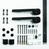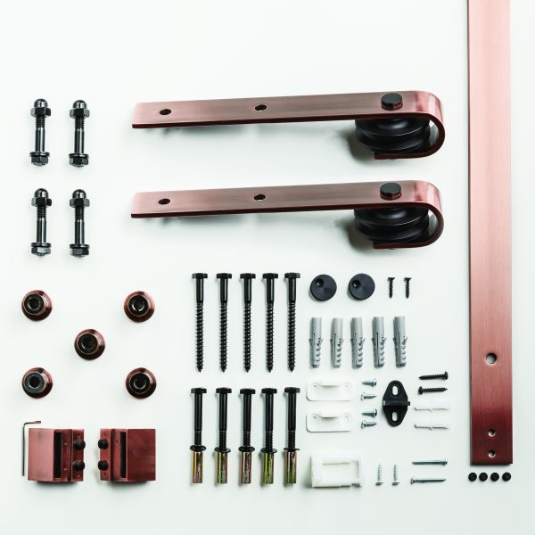 The Bent Barn Door Hardware Kit strap system features a classic face mount flat strap to hang wood doors on a traditional rail track. The large wheels provide excellent strength and durability as-well-as smoothness of travel along the barn door track.
